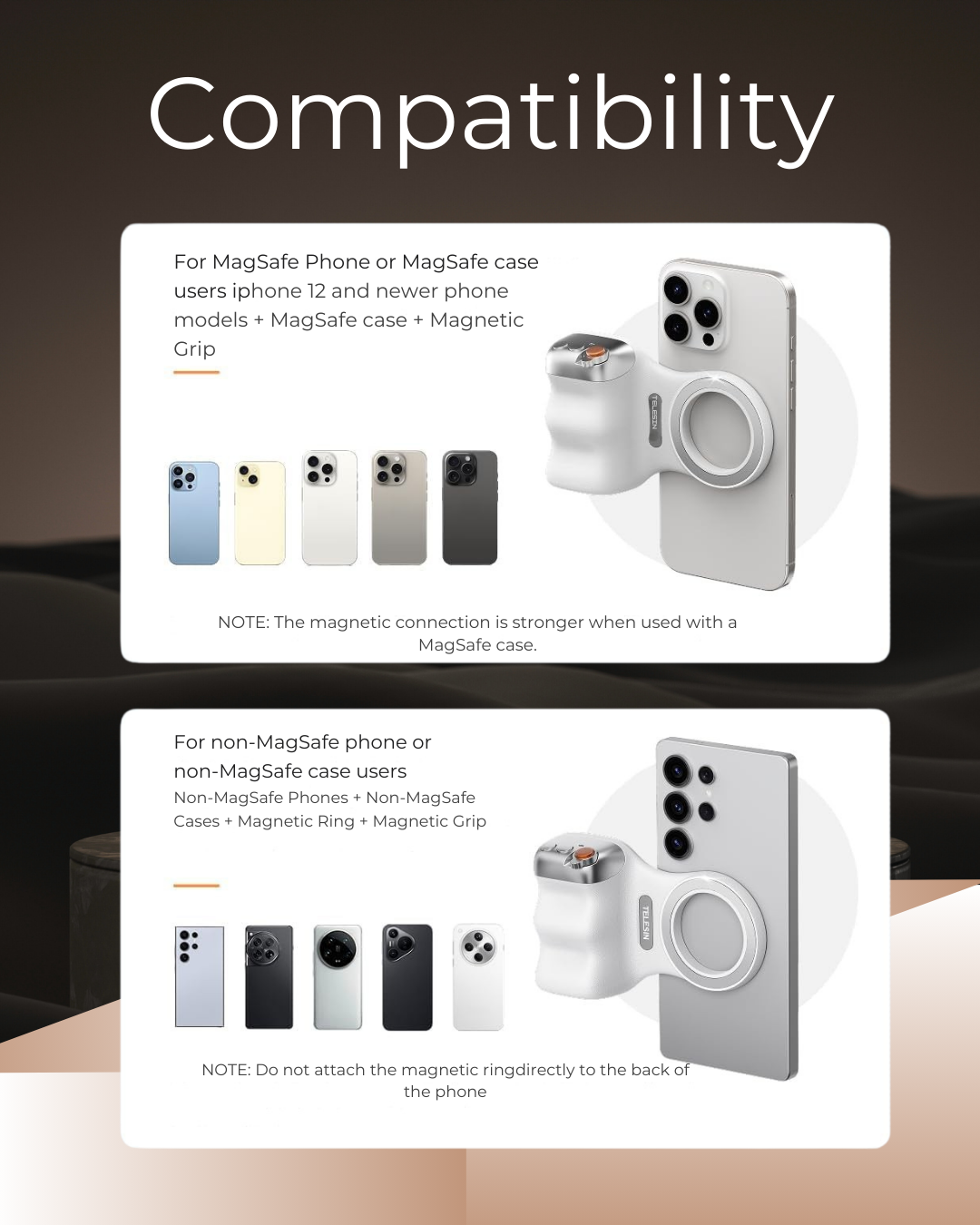 Potente estabilidad magnética : 8 potentes imanes sujetan los teléfonos (190–250 g) con firmeza, incluso en ángulos extremos. Incluye anillo magnético para una fijación suave.